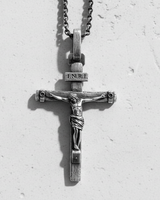 INRI Crucifix Pendant sterling silver cross shown with chain on white background demonstrating wearable size INRI Crucifix Pendant sterling silver cross shown with chain on white background demonstrating wearable size