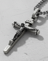 INRI Crucifix Pendant sterling silver cross shown with chain on white background demonstrating wearable size