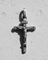 Front centered view of INRI Crucifix Pendant 925 silver cross with Jesus corpus and sacred inscription