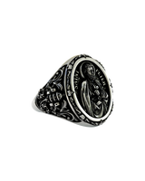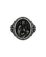 Embrace divine protection with this magnificent Saint Peter signet ring, expertly crafted in premium 925 sterling silver. The oval centerpiece showcases Saint Peter in exquisite detail, holding the sacred keys to heaven as described in scripture. Surrounding the saint's portrait, ornate baroque flourishes and religious motifs create a frame of devotion, while the sides feature intricate crosses and floral patterns. This substantial 13-gram ring combines traditional religious iconography with masterful craftsmanship, offering both spiritual significance and timeless style. The oxidized finish accentuates every detail of the engraving, from Peter's flowing robes to the symbolic keys. Perfect for those seeking a meaningful connection to their faith through exceptional religious jewelry that serves as both a statement piece and daily reminder of divine guidance.