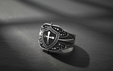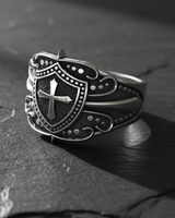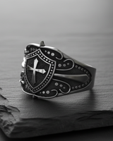 Embody strength and unyielding faith with this handcrafted 925 sterling silver cross shield ring. Designed for those who appreciate medieval symbolism and historical elegance, the centerpiece features a bold shield motif adorned with a raised Latin cross and intricate beaded detailing. The dark oxidized finish adds depth to the textured background, perfectly highlighting the skilled craftsmanship involved in every curve and dot. Flanking the central shield, elegant scrollwork and stylized floral patterns flow seamlessly along the sturdy band, creating a timeless piece of religious jewelry that commands attention. Whether worn as a powerful symbol of protection or a personal statement of devotion, this durable silver ring makes a meaningful gift for him. Perfect for adding a touch of gothic flair to daily wear or elevating your style for special occasions, this ring stands as a testament to superior artistry and premium quality.