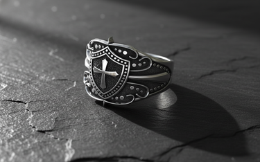 Front view of handcrafted 925 sterling silver cross shield ring on textured dark stone background Front view of handcrafted 925 sterling silver cross shield ring on textured dark stone background