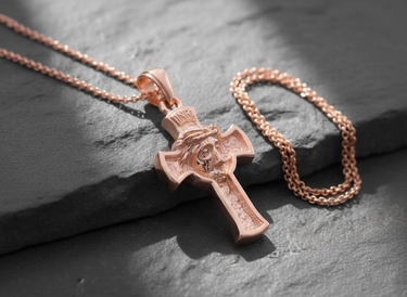 Rose gold plated Jesus cross pendant with detailed face and crown of thorns, shot from above on a dark slate background.