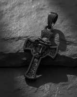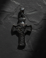 Silver Jesus Cross Pendant with an oxidized finish and chain, shown at an angle on pieces of dark, textured slate rock. Silver Jesus Cross Pendant with an oxidized finish and chain, shown at an angle on pieces of dark, textured slate rock.