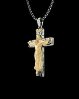 Angled view of the 925 sterling silver crucifix pendant, highlighting the detailed craftsmanship of the gold corpus and bail. Angled view of the 925 sterling silver crucifix pendant, highlighting the detailed craftsmanship of the gold corpus and bail.