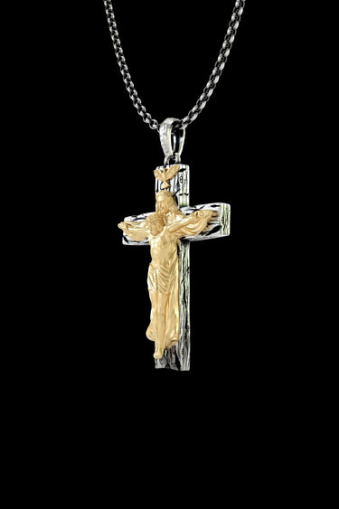 Honor your faith with this magnificent Jesus Crucifix Cross Pendant, a sacred masterpiece crafted in authentic 925 sterling silver with radiant gold vermeil. This profound design features Christ rendered in luminous gold upon a textured wooden-style cross in oxidized silver, creating powerful visual contrast. The eagle detail at the crown and INRI inscription honor traditional Christian iconography. Every detail, from the flowing robes to the anatomically sculpted corpus, showcases reverent craftsmanship worthy of this holy symbol. The wood-grain texture on the cross adds rustic authenticity to this timeless piece. Perfect for devoted Christians, confirmation gifts, and those seeking daily reminders of Christ's sacrifice. A meaningful expression of faith to wear close to your heart.