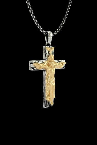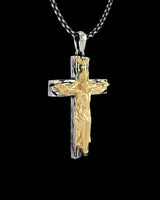 Handmade silver crucifix pendant with a gold vermeil Jesus figure on a textured cross, shown on a sterling silver chain.
