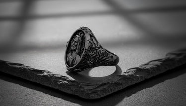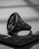 Side angle view of oxidized silver Jesus signet ring showing ornate Gothic border details and band thickness Side angle view of oxidized silver Jesus signet ring showing ornate Gothic border details and band thickness