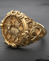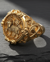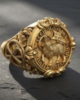 Wear a profound symbol of faith with this masterfully crafted Silver Lamb of God Ring. The centerpiece features the sacred Agnus Dei, the lamb holding the banner of victory, encircled by the powerful Latin inscription 'Ecce Agnus Dei'. On the shanks, the ancient Chi-Rho monogram is intricately carved amidst ornate scrollwork, adding layers of historical and spiritual significance. Forged from solid 925 sterling silver, this ring offers both enduring quality and a comfortable weight for daily wear. The oxidized finish is expertly applied to highlight every minute detail, giving the piece a striking, antique-like depth. Perfect as a personal testament of faith or a meaningful gift, this exceptional Christian signet ring is more than jewelry—it's a wearable piece of devotion. This Silver Lamb of God Ring is a timeless expression of belief.