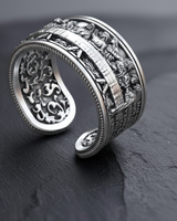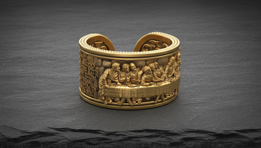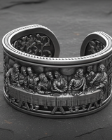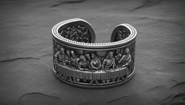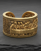 Capture the spiritual essence of Leonardo da Vinci's masterpiece with this exquisite Silver Last Supper Ring. Meticulously handcrafted from premium 925 sterling silver, this wide-band ring features a stunning high-relief depiction of Jesus and his disciples gathered at the holy table. The intricate detailing brings the sacred scene to life, while the sides are adorned with engraved Latin scripture, adding depth and historical significance to the design. Designed with an open-back cuff style for a comfortable, adjustable fit, this religious statement piece is a wearable work of art that serves as a powerful symbol of faith. Whether chosen as a meaningful gift for a loved one or a personal token of devotion, this handcrafted ring blends classic artistry with modern jewelry craftsmanship. Perfect for daily wear or special occasions, this durable silver ring ensures a lasting connection to spiritual heritage.