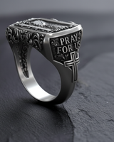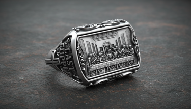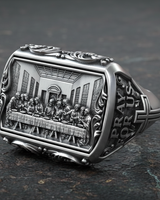 Carry a masterpiece of faith and art with this exquisite Silver Last Supper Ring. The rectangular signet face features a high-relief engraving of Leonardo da Vinci’s iconic portrayal of Jesus and the twelve apostles, capturing the solemnity of the biblical moment in minute detail. Expertly handcrafted from solid 925 sterling silver, this religious ring combines spiritual devotion with artisanal luxury, ensuring a substantial and durable feel on the finger. Intricate floral scrollwork adorns the shank, adding a touch of vintage elegance to the bold silhouette, while an oxidized finish highlights the depth of the carving. Perfect for those seeking meaningful Christian jewelry or a unique statement accessory, it blends classic art with modern style. Whether as a personal token of belief or a thoughtful gift for him, this Silver Last Supper Ring stands as a timeless symbol of history and faith.