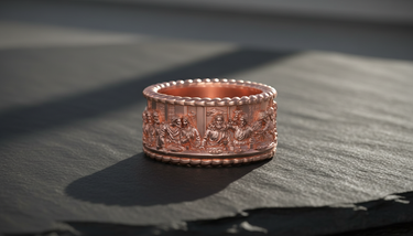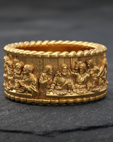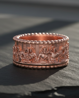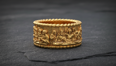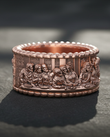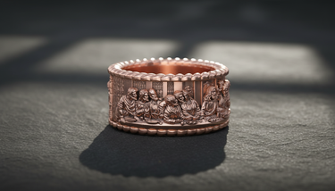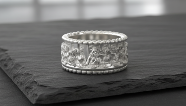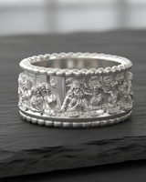 Carry a masterpiece of sacred art with this exquisite Silver Last Supper Ring. Expertly capturing the iconic moment of Jesus Christ and the Twelve Apostles, this continuous band features intricate relief work that brings the famous biblical scene to life. Crafted from premium 925 sterling silver, the ring is framed by elegant rope-textured borders that enhance its classic aesthetic and durability. The oxidized finish adds remarkable depth to each figure, ensuring every minute detail is visible and striking. Perfect for those who cherish their faith, this religious jewelry piece serves as a constant reminder of spiritual devotion. Whether worn as a unique wedding band or a meaningful statement piece, this Silver Last Supper Ring offers both timeless craftsmanship and divine inspiration, making it a thoughtful gift for men.