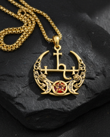 Rose gold plated Lilith Sigil Pendant featuring triple moon design and red stone detail on dark textured rock background Rose gold plated Lilith Sigil Pendant featuring triple moon design and red stone detail on dark textured rock background