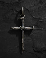 925 sterling silver nail cross pendant with oxidized finish and wire binding detail on dark wood surface