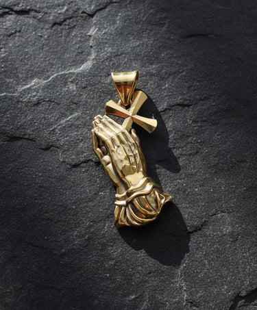 Close-up of gold vermeil praying hands pendant displaying intricate hand positioning and fabric folds Close-up of gold vermeil praying hands pendant displaying intricate hand positioning and fabric folds