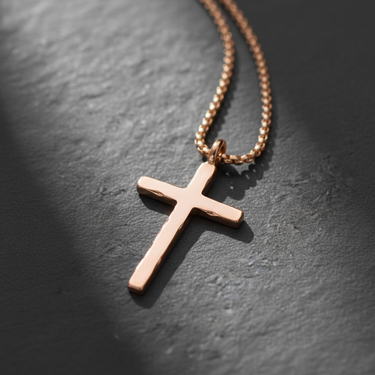 Rose gold plated silver cross necklace with vintage rustic design resting on textured grey stone
