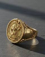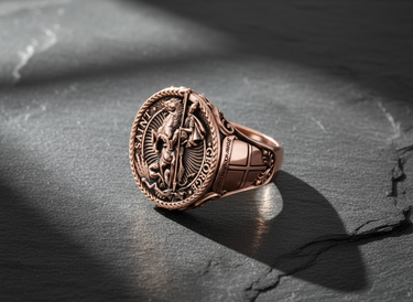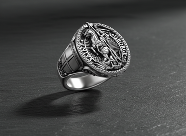 Angled view of silver signet ring with Saint George engraving and textured inner band design