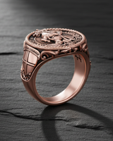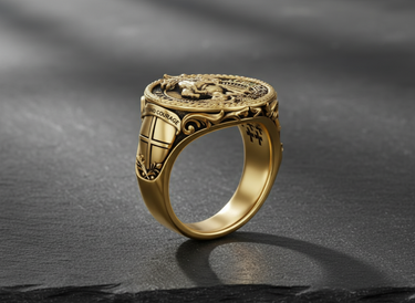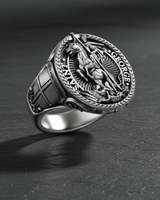 Channel the spirit of legendary bravery with this exquisite silver Saint George ring. Meticulously handcrafted from premium 925 sterling silver, this commanding signet ring depicts the iconic scene of Saint George slaying the dragon, representing the ultimate triumph of good over evil. The detailed face is bordered by the inscription "SAINT GEORGE," while the robust shank features a sculpted crusader shield and the inspiring motto "FAITH AND COURAGE." An antique oxidized finish highlights the intricate textures of the knight's armor and the mythical beast, adding historical depth to this powerful talisman. Ideal for history enthusiasts and men seeking a unique symbol of protection, this silver Saint George ring combines spiritual significance with rugged style. Whether worn as a daily statement piece or gifted for a special occasion, its solid craftsmanship guarantees lasting durability.