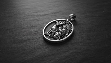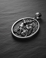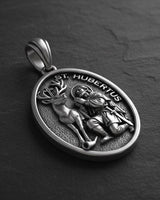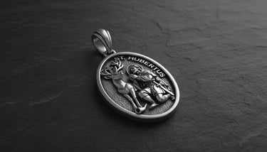 Honor the patron saint of hunters with this exquisite Saint Hubert pendant, masterfully crafted from premium 925 sterling silver with gold vermeil finish. The detailed relief showcases Saint Hubert kneeling before the miraculous stag with a cross between its antlers, capturing this legendary moment of spiritual transformation. Each element is meticulously hand-carved by skilled artisans, from the saint's flowing robes to the majestic deer's antlers. This Saint Hubert medal serves as both a powerful religious symbol and stunning piece of Catholic jewelry. Perfect for hunters, outdoor enthusiasts, or anyone seeking spiritual protection, this handmade pendant makes an meaningful gift. The durable sterling silver construction ensures lasting beauty while the oval design creates an elegant silhouette that complements any style.