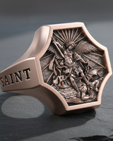 Channel divine protection and strength with this handcrafted Silver Saint Michael Ring. The striking octagonal signet features a detailed bas-relief of Archangel Michael triumphing over Satan, capturing the intensity of the spiritual battle in exquisite depth. Cast in premium 925 sterling silver, this piece is available in a rugged oxidized finish or luxurious gold vermeil, ensuring a style that suits every preference. The shank is boldly engraved with "SAINT" and "MICHAEL" on the sides, adding a powerful dimension to the design. Perfect for those who cherish religious symbolism or mythology, this ring serves as a durable talisman of courage and faith. Whether worn as a daily statement piece or given as a meaningful gift, this masterfully crafted ring combines spiritual significance with timeless jewelry artistry.
