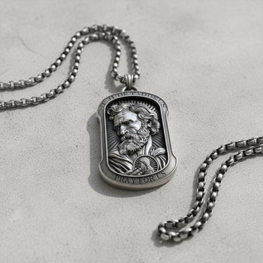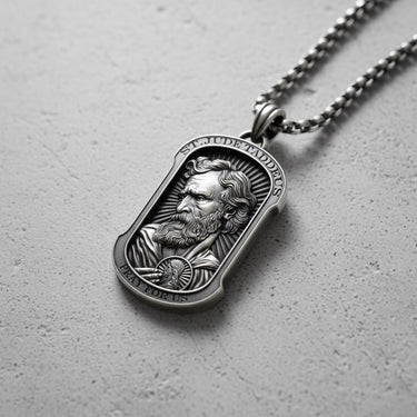 Find hope in desperate times with this handcrafted St. Jude Taddeus pendant, masterfully created from premium 925 sterling silver. The detailed relief showcases Saint Jude's compassionate expression with flowing hair and beard, surrounded by radiating lines that symbolize divine light and protection. This religious pendant features the inscription "ST. JUDE TADDEUS" at the top and "PRAY FOR US" at the bottom, making it a powerful talisman for those seeking guidance. The oxidized finish enhances every intricate detail, from the saint's robes to the sacred medallion he holds. Perfect for daily wear or special occasions, this St. Jude pendant serves as both a meaningful spiritual accessory and elegant jewelry piece, making it an ideal gift for loved ones facing challenges.