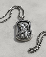 Religious pendant necklace featuring St. Jude with oxidized finish and chain displayed on black background Religious pendant necklace featuring St. Jude with oxidized finish and chain displayed on black background
