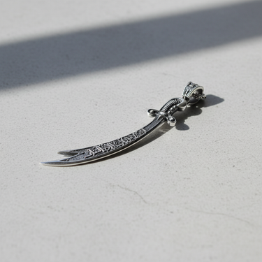 Close-up of handcrafted Islamic sword pendant with oxidized finish and polished silver chain loop Close-up of handcrafted Islamic sword pendant with oxidized finish and polished silver chain loop
