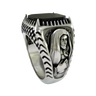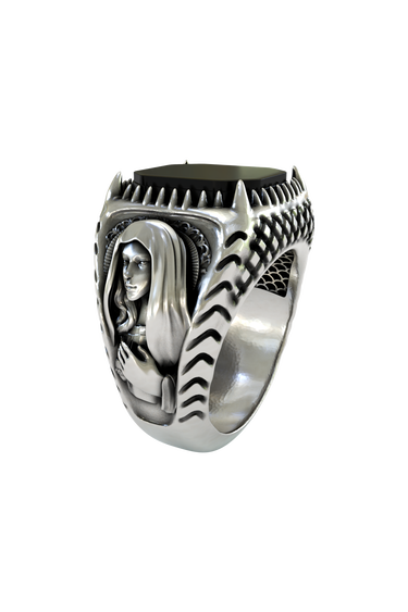 Experience divine maternal protection with this masterfully crafted 925 sterling silver ring featuring the Blessed Virgin Mary surrounded by powerful dragon elements. The intricate design showcases sacred symbolism with detailed serpentine scales wrapped around a crown of protective spikes, creating the perfect fusion of maternal love and mystical guardianship. Each scale, facial detail, and divine element is meticulously engraved with museum-quality precision, while the gemstone center adds celestial depth. This commanding statement piece represents divine protection, maternal blessing, and spiritual guidance. Available with premium gemstone options including Black Onyx, Tiger Eye, Carnelian, and Lapis Lazuli for devoted believers.