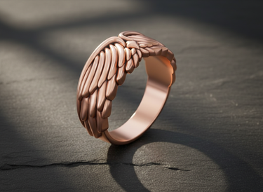 Rose gold plated silver angel wing ring featuring detailed feather plumage displayed on dark slate background Rose gold plated silver angel wing ring featuring detailed feather plumage displayed on dark slate background
