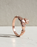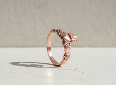 Handcrafted 925 sterling silver Claddagh ring featuring hands holding a crowned heart design on textured surface Handcrafted 925 sterling silver Claddagh ring featuring hands holding a crowned heart design on textured surface