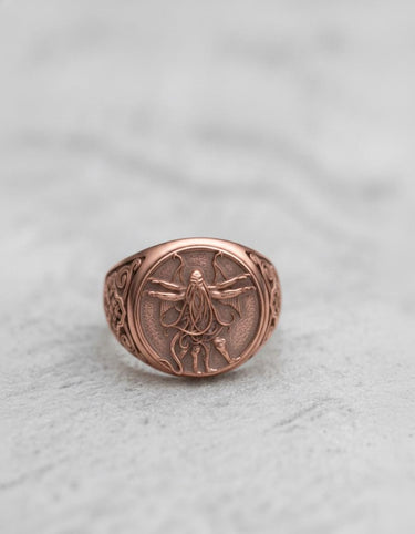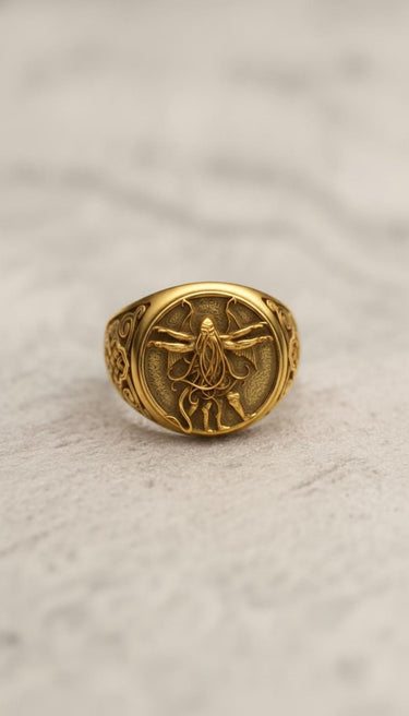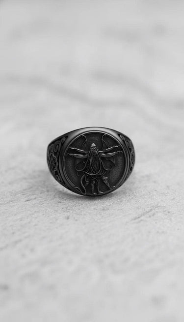 Heed the call from the depths with our masterfully crafted Silver Cthulhu Ring, a powerful tribute to the cosmic horror of H.P. Lovecraft. This striking piece captures the Great Old One in all his terrifying glory, from the intricate web of tentacles to the imposing draconic wings, all set against an oxidized background that enhances every detail. Forged from premium 925 sterling silver, this ring promises both enduring quality and a comfortable fit for daily wear or as a focal point for special occasions. The band itself is adorned with ornate, swirling patterns, adding to its mysterious and ancient allure. This handcrafted Silver Cthulhu Ring is more than just jewelry; it is a wearable artifact for aficionados of the macabre and a perfect statement piece for those who dare to embrace the abyss.