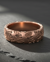 Angled view of handcrafted silver ring with engraved Egyptian hieroglyphics and brushed metal finish Angled view of handcrafted silver ring with engraved Egyptian hieroglyphics and brushed metal finish