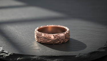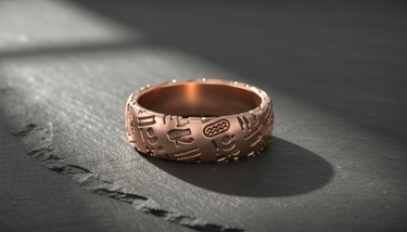 Angled view of handcrafted silver ring with engraved Egyptian hieroglyphics and brushed metal finish