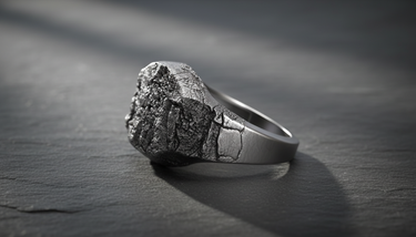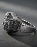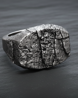 Detailed close-up of handcrafted silver ring with rugged stone effect and irregular cracks for unique men's style