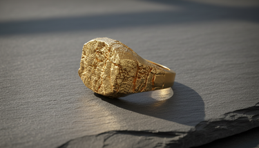 Angled side profile of silver rock texture ring showing heavy band and oxidized details on a slate surface Angled side profile of silver rock texture ring showing heavy band and oxidized details on a slate surface