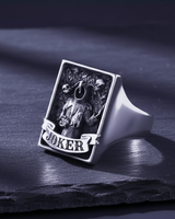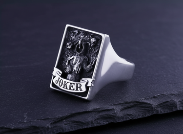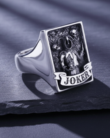 Unleash your playful yet dark side with this handcrafted silver Joker signet ring, a masterpiece of gothic storytelling. The rectangular face prominently showcases an intricately detailed jester figure holding a sinister skull, flanked by floating skulls that add a macabre depth to the design. A classic ribbon banner inscribed with "JOKER" anchors the artwork, set against a rugged, textured background that enhances its vintage appeal. Meticulously cast in premium 925 sterling silver, this ring combines edgy aesthetics with timeless signet style, ensuring lasting quality. The expert oxidation and polishing highlight the fine craftsmanship, making every shadow and highlight pop. Perfect for biking enthusiasts and those who appreciate bold, symbolic jewelry, this silver Joker ring makes an unforgettable statement. Whether worn as a symbol of duality or simply as a unique fashion accessory, it offers exceptional comfort for daily wear. Elevate your personal style and command attention with this distinctive piece of men's jewelry that blends rebellion with luxury.