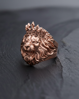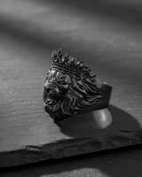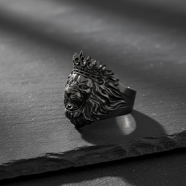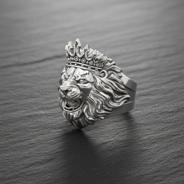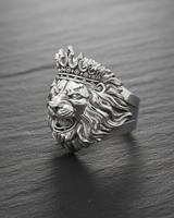 Close-up of 925 sterling silver lion head ring with crown showing oxidized details and ferocious roaring design Close-up of 925 sterling silver lion head ring with crown showing oxidized details and ferocious roaring design