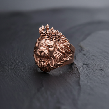 Front view of luxurious gold vermeil lion crown ring featuring detailed roaring expression on dark slate background Front view of luxurious gold vermeil lion crown ring featuring detailed roaring expression on dark slate background