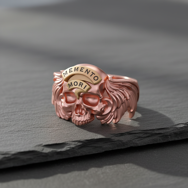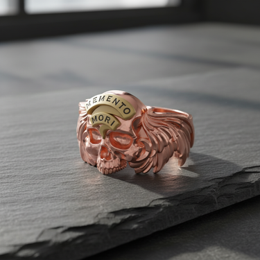 Embrace life's profound reminder with our handcrafted Silver Memento Mori Ring. This striking piece features a meticulously detailed skull, flanked by majestic, feathered wings that wrap around the band. Across the forehead, a contrasting gold-tone banner bears the Stoic phrase 'Memento Mori,' a powerful call to live fully. Forged from premium 925 sterling silver, the ring's oxidized finish creates a dramatic backdrop, highlighting every intricate detail carved by our master artisans. This exceptional piece is more than just jewelry; it's a wearable philosophy, perfect for those with a gothic or biker aesthetic. Make a bold statement and carry a timeless message with this exceptional Silver Memento Mori Ring, a testament to superior craftsmanship and enduring style. This powerful winged skull ring is a potent symbol of mortality and the urgency of the present.