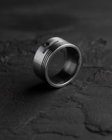 Minimalist 925 sterling silver piston ring with engine groove details displayed on textured grey surface Minimalist 925 sterling silver piston ring with engine groove details displayed on textured grey surface