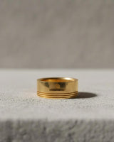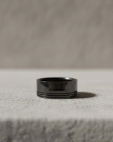 Minimalist 925 sterling silver piston ring with engine groove details displayed on textured grey surface