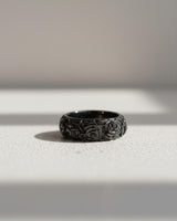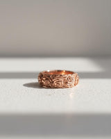 Silver rose ring with a detailed, repeating floral pattern shown at an angle on a light gray textured surface. Silver rose ring with a detailed, repeating floral pattern shown at an angle on a light gray textured surface.