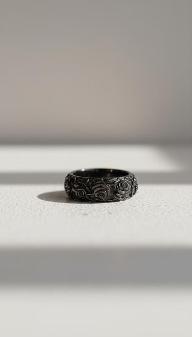 Black and white photo of the sterling silver rose ring, highlighting the oxidized finish and deep petal details on a white surface. Black and white photo of the sterling silver rose ring, highlighting the oxidized finish and deep petal details on a white surface.