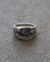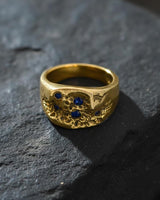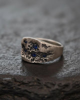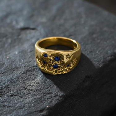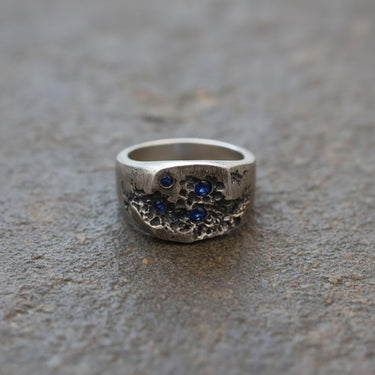 Discover a universe on your finger with our handcrafted Sapphire Crater Ring, a masterpiece of rugged elegance. This exceptional piece is forged from solid 925 sterling silver, featuring a deeply textured, cratered surface that evokes the mystique of a lunar landscape. Scattered across this dramatic terrain are brilliant blue sapphires, bezel-set like distant stars in a galactic expanse, adding a vibrant splash of celestial color. Meticulously crafted by our artisans, the ring's substantial feel and unique design make it a standout modern signet. Available in classic oxidized silver or a luxurious 14K gold vermeil finish, this ring is a statement of bold individuality. Perfect as a signature accessory or a meaningful gift, this men's Sapphire Crater Ring merges cosmic inspiration with timeless craftsmanship for a truly unforgettable piece of jewelry.
