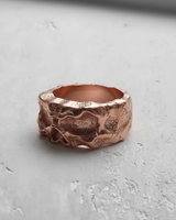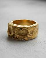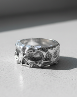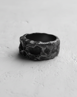 Side profile of the wide band silver skull ring, detailing the unique molten metal texture on the 925 silver surface. Side profile of the wide band silver skull ring, detailing the unique molten metal texture on the 925 silver surface.