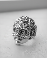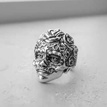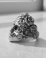 Celebrate life and heritage with our masterfully crafted Silver Sugar Skull Ring, a striking tribute to the iconic Calavera. This piece is not just jewelry; it's wearable art, capturing the vibrant spirit of Día de los Muertos. Every detail is meticulously sculpted, from the ornate crown of roses to the delicate cross on the forehead and the intricate scrollwork that adorns the face. Handcrafted from solid 925 sterling silver, the ring features an oxidized finish that accentuates its profound depth and complex textures, making each carving stand out. This bold statement ring is perfect for those who honor cultural traditions or seek a unique piece of gothic-inspired jewelry. More than an accessory, this powerful Silver Sugar Skull Ring is a symbol of remembrance and artistic expression, designed to be cherished for a lifetime.