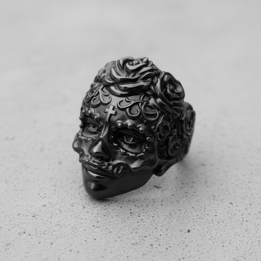 Oxidized silver sugar skull ring showcasing intricate scrollwork and floral details, angled on a textured gray background. Oxidized silver sugar skull ring showcasing intricate scrollwork and floral details, angled on a textured gray background.