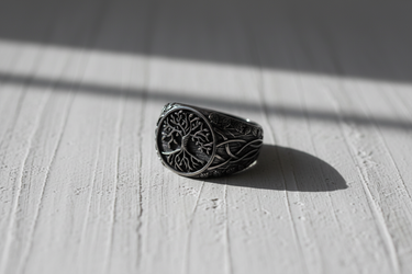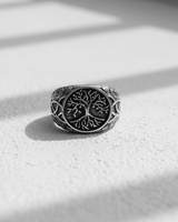 Connect with the ancient cosmos using this handcrafted Silver Yggdrasil Ring. The central design features the sacred Tree of Life, deeply engraved into premium 925 sterling silver to symbolize eternal growth, strength, and connection. Expertly finished with black rhodium plating, the darkened background contrasts strikingly with the polished silver, highlighting the intricate roots and spreading branches that weave into elaborate Celtic knot patterns along the shank. This Silver Yggdrasil Ring serves as a powerful talisman of Norse mythology, representing the cycle of life and nature's enduring power. Whether you are a dedicated fan of ancient legends or simply seeking a meaningful accessory, this durable piece offers exceptional comfort and unique style. Perfect for daily wear or as a distinct gift for him, it elevates any look with its rich symbolism and superior artisan craftsmanship.