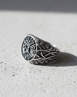 Connect with the ancient cosmos through this handcrafted Silver Yggdrasil Ring, a symbol of eternal growth and wisdom. Depicting the sacred Norse Tree of Life, the round signet face features intricate branches and deep roots that symbolize the connection between all nine worlds. The shank is adorned with detailed Celtic knotwork and delicate leaf motifs, adding profound depth and texture to the design. Expertly cast in premium 925 sterling silver, this ring offers a substantial weight and comfortable fit, ensuring durability for daily wear. Whether you prefer the classic oxidized finish that highlights the relief or the rose gold plated variation for a warm glow, the superior craftsmanship is evident in every curve. Ideally suited for mythology enthusiasts and those seeking meaningful men's jewelry, this Tree of Life ring serves as a powerful amulet of strength. Elevate your personal style today with a statement piece that seamlessly blends ancient legend with modern luxury.