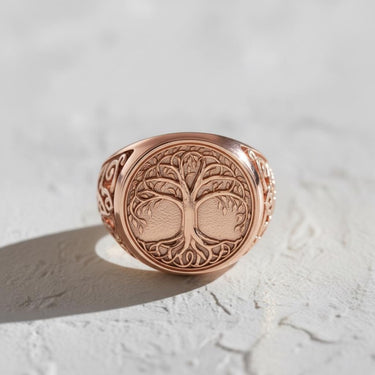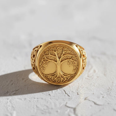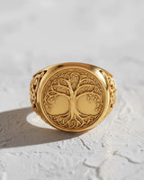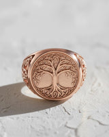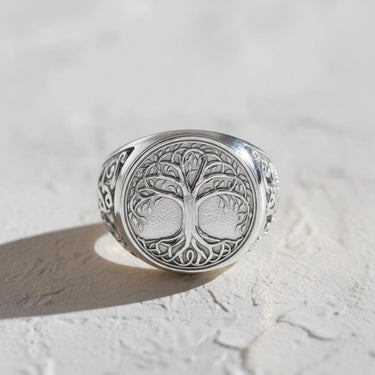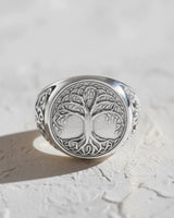 Front view of the Silver Yggdrasil Ring showcasing the intricate Tree of Life design on its face, set on a white surface. Front view of the Silver Yggdrasil Ring showcasing the intricate Tree of Life design on its face, set on a white surface.